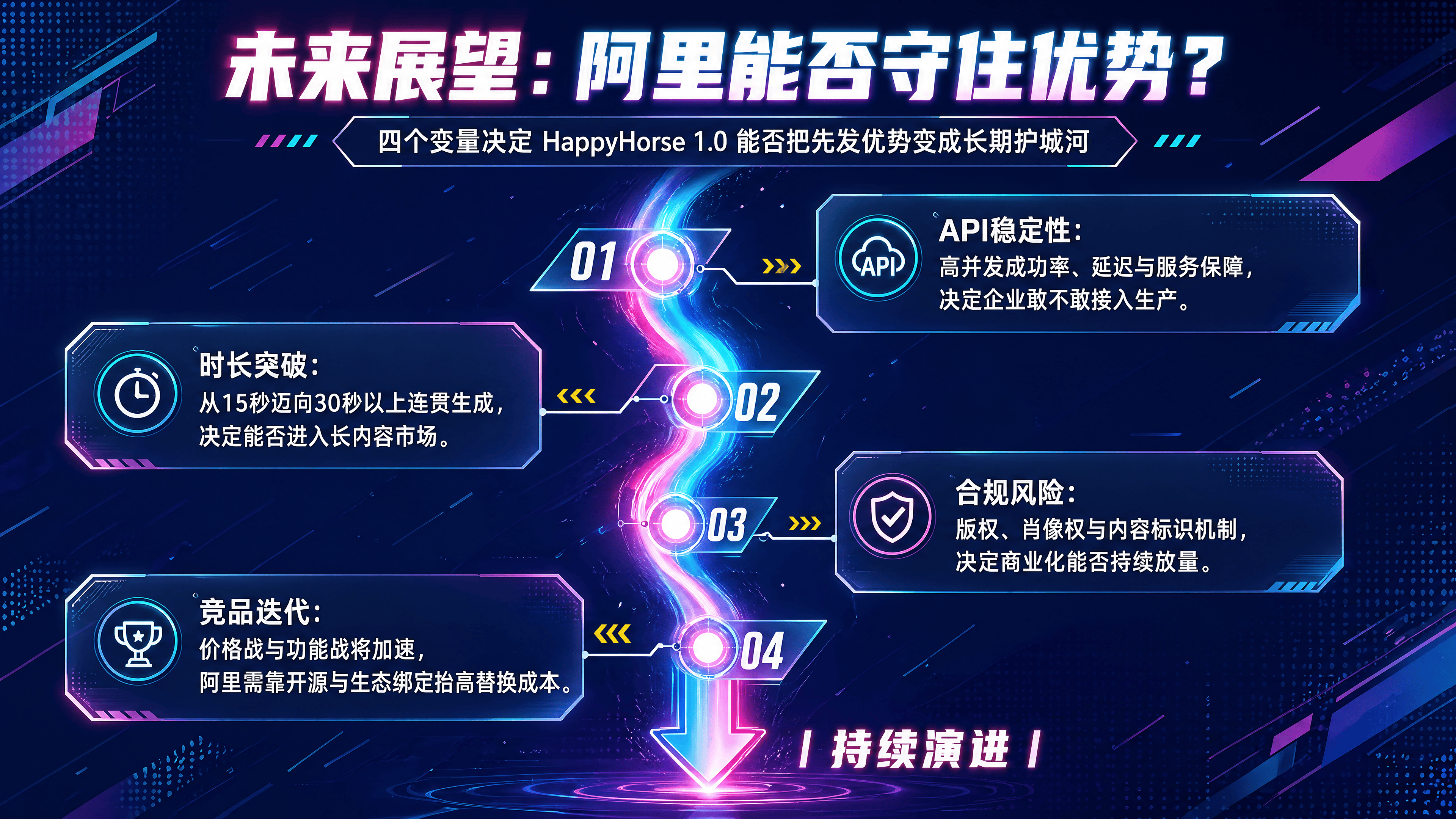 HappyHorse 1.0 的开局堪称完美:技术领先、定价激进、生态完备。但要真正站稳脚跟,还需关注以下几个变量:
