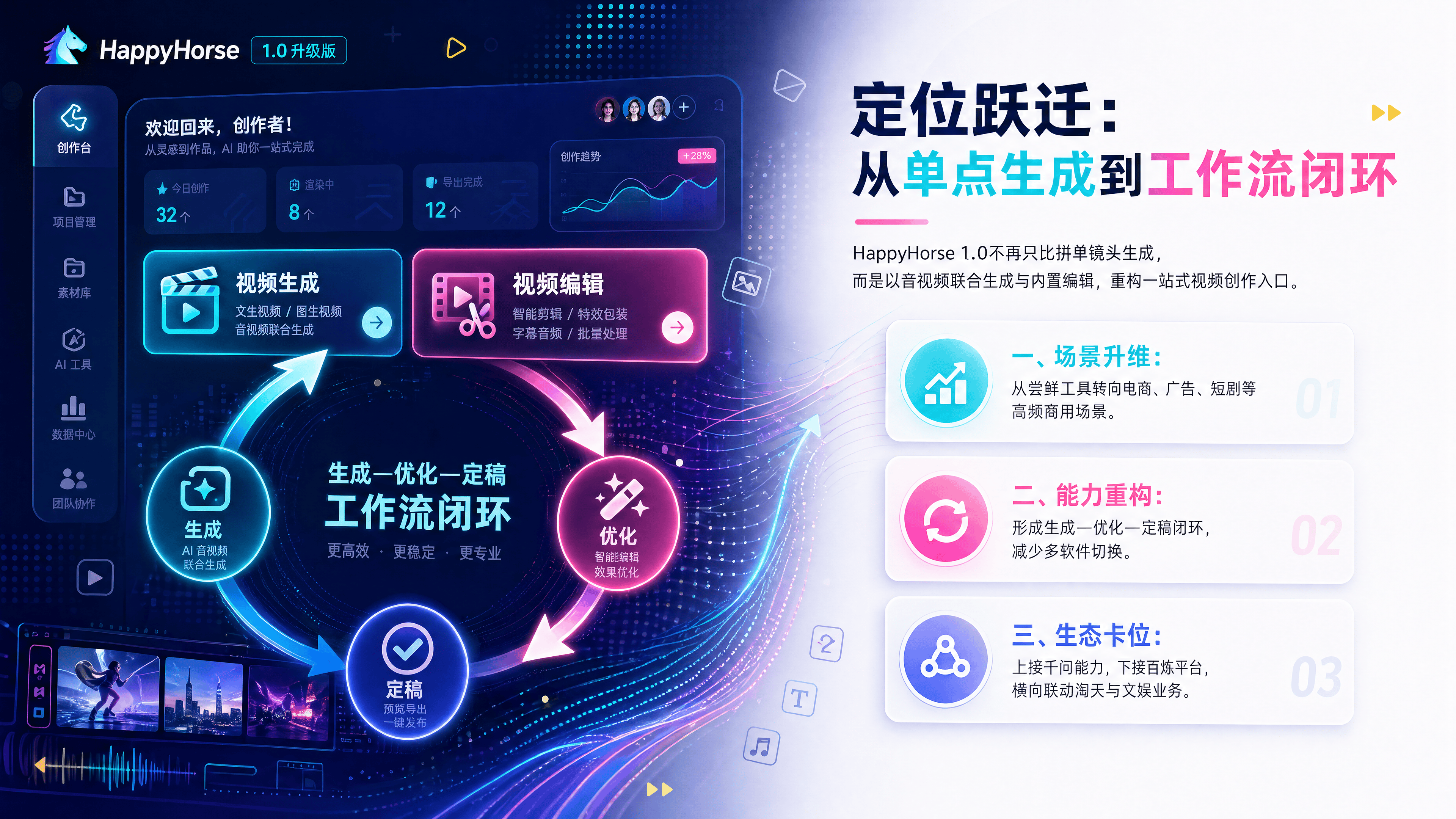 HappyHorse 1.0 的出现,并非仅仅为了在评测榜单上多拿一个第一,其核心野心在于重新定义视频创作的入口。它不再是一个孤立的生成模型,而是一个面向电商、广告、短剧等高频场景的一站式AI视频创作工作流平台。